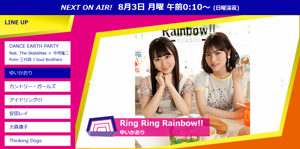 NHK総合テレビ「MUSIC JAPAN」8/3(月)午前0:10~(日曜深夜)放送回に花澤香菜がコメント出演します! ゲストのゆいかおりさんにメッセージをお送りさせていただきました! 是非チェックしてください!http://t.co/Hpom9aGnfO(ス)#hanazawa